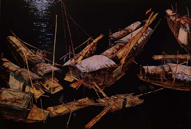 李梦红 《夜伴渔歌之一》漆画120X180CM