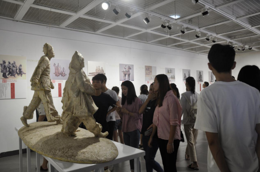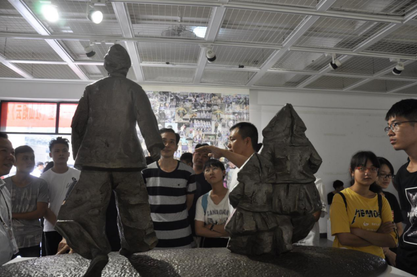 开幕式上,刘宇航老师介绍作品的创作情况与作品创意。刘宇航老师近几年来关于少数民族题材的雕塑创作作品,通过“国家艺术基金2016年度青年艺术创作人才资助项目”的支持,深入到少数民族地区采风,收集了大量的民族元素素材,从中获得创作灵感,创作出雕塑作品《壮山烟云》。本次展览不仅展示了雕塑作品,而且通过展板的形式完整而详细的展示了刘宇航老师从创作手稿到雕塑小稿再到放大成稿的创作过程。接着,黄月新院长为本次展览致词。黄院长表示刘宇航老师的雕塑作品《壮山烟云》在平凡中展现美感相比之下更加含蓄、耐人寻味,用细腻的艺术手法处理作品,深刻表达了刘宇航老师对民族梦和中国梦美好追求,值得各位师生学习。最后,由刘旭朝书记宣布展览开幕。开幕式结束后,全体师生进入展厅观展,获得了一致好评。